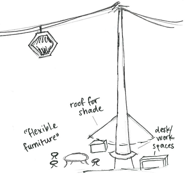 This ultimately brings us to the question of how a space can really be ‘community’ controlled, and whether a design intervention can somehow facilitate this. For our group project, we conceived of making use of the space opened up around the pillars that have cut into the urban fabric as essential to cable car infrastructure. The idea was to provide very loose and flexible infrastructure or even ‘furniture’ that could be more easily appropriated by surrounding neighborhoods (its small scale makes it more easily appropriated, as is suggested by Navarro-Sertich, 2011). This stemmed from Peter Kellett’s lecture about the diversity of livelihoods in informal areas. We began thinking how in dense informal areas such as that found in Comuna 8, boundaries between ‘home’ and ‘work’ and other spaces used throughout the day are not always clear. One of Kellett’s examples showed a woman in a city of northern Colombia who ran a tailoring business from home. Another example showed a woman who had used a room of her house as a school, shifting the contents of the space quickly to accommodate a group of schoolchildren with not many other places to go.