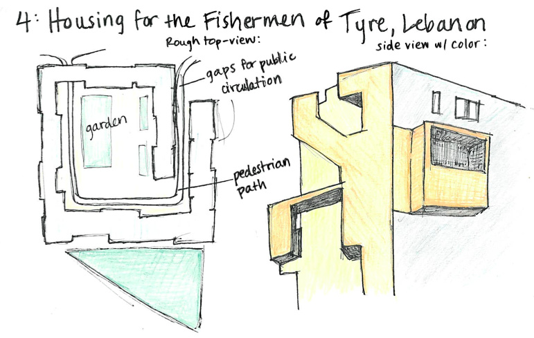 tyre housing.pngAnother type of “shared control” explored in our course was that of a housing cooperative for the fisherman of Tyre, Lebanon. The structure is semi-enclosed with shared common areas but with many gaps for circulation with the outside world.