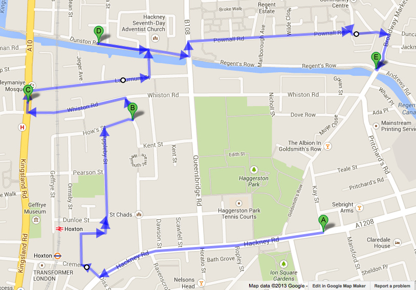Haggerston is a neighborhood in the London borough of Hackney, which is classified as one of the most deprived areas of the UK. It is also a rapidly changing area as property values rise in conjunction with the “regeneration” of East London, especially since the 2012 Olympic Games were hosted very nearby. This walk was a preliminary mapping exercise that is part of a university project centering on East London.