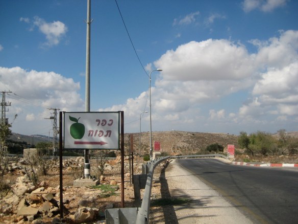 A sign for the settlement of Kfar Tapuach (literally, “Appleville”), just south of Nablus. Fruit seems to be a recurring symbol on this day, as in one settlement, an over-sized grape statue graced a small roundabout near the entrance gate.